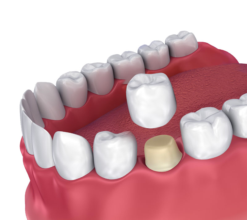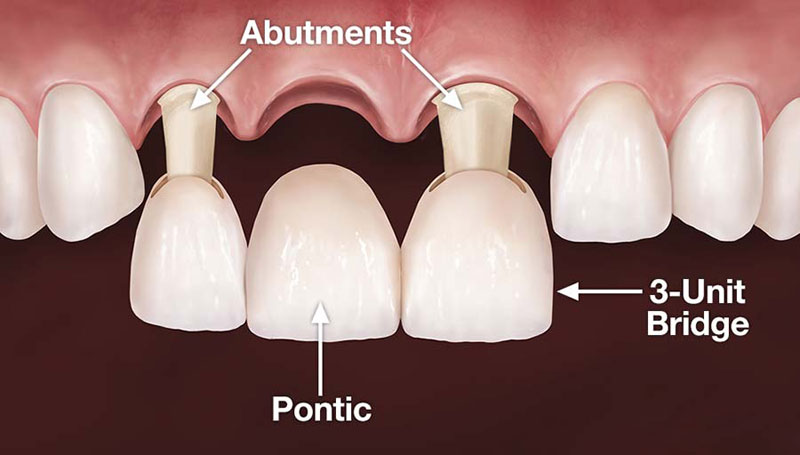 Impression is then sent to dental lab to make your crown or bridge, in the specific material A temporary crown or bridge will be put in place to cover the prepared tooth while the permanent crown or bridge is being made. When the permanent crown or bridge is ready, the temporary crown or bridge is then removed, and the new crown or bridge is cemented over your prepared tooth or teeth. Thus for single missing tooth you will get two crowns on teeth adjacent to missing tooth and a false tooth or say pontic in between.